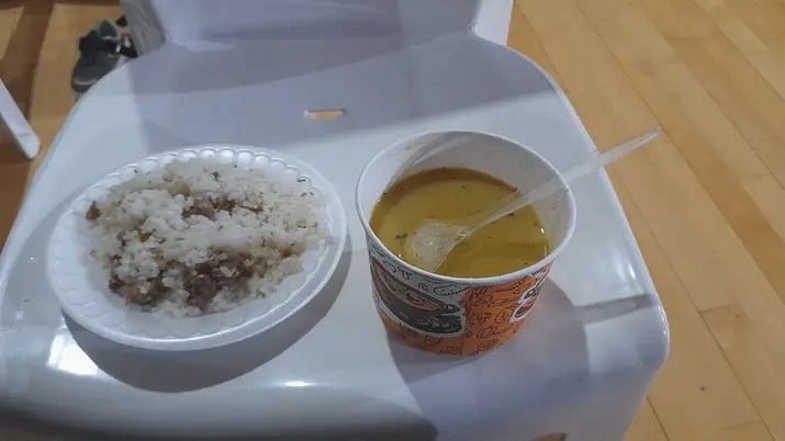 This is the biggest, best, and healthiest meal I have had in days. Thank God for the kind and generous volunteers who were willing and able to cook enough rice, beef, and soup to feed 200+ people.